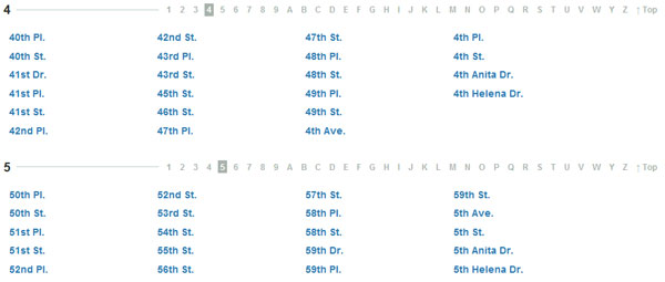 Product Planner 采用了標(biāo)準(zhǔn)的分頁顯示,有頁碼數(shù)字,有上一頁下一頁。但是,你能告訴我第2頁是什么? 第3頁?當(dāng)然你不能。不用擔(dān)心,標(biāo)準(zhǔn)分頁可以得到改善。如下所示,通訊錄很龐大,他們使用了數(shù)字和字母來分頁。在這個(gè)例子里顯示所有的頁和隱藏頁一樣好。你可以以此類推應(yīng)用到其他條件相似的表格。如果表格以日期來分類,你可以以日期范圍來替代傳統(tǒng)的分頁數(shù)字(如第1頁可以寫成2.10-2.12,等等)