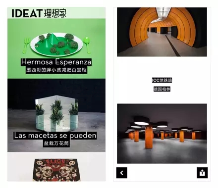 IDEAT理想家App,繼承了法國IDEAT雜志的理念,以展示設(shè)計(jì)、藝術(shù)和風(fēng)尚的「當(dāng)代生活」內(nèi)容為主。App界面上除了內(nèi)容圖片之外,幾乎沒有黑白以外的其他色彩元素。通過襯以黑底的高亮白字,既是內(nèi)容又是裝飾,貫穿在整個(gè)App設(shè)計(jì)元素當(dāng)中;調(diào)節(jié)這些文字與其他內(nèi)容之間的間距,又在排版上起到作為點(diǎn),作為線,甚至作為面的不同功用。