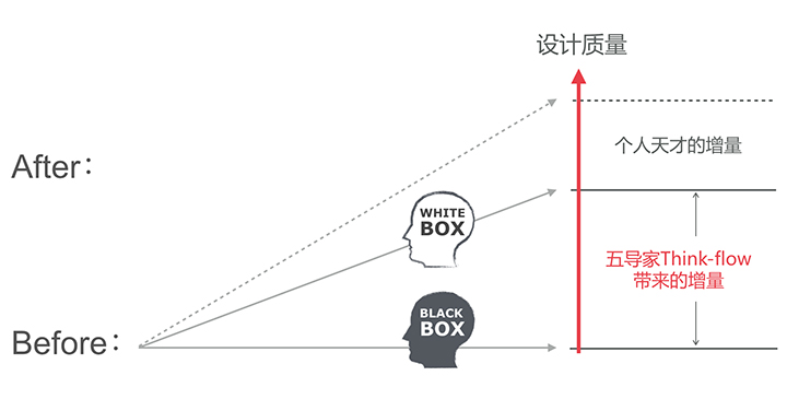 業(yè)務(wù)協(xié)同其實大家都不難理解,所有UED都在做這樣的事情,保質(zhì)保量的完成業(yè)務(wù)需求,不斷迭代產(chǎn)品進度;設(shè)計增值就有一些難度了,首先要搞清楚如何論證設(shè)計的價值,才能說出增值有多少,所以針對這個問題我們打造了頁面數(shù)據(jù)統(tǒng)計工具,方便設(shè)計師、開發(fā)、運營、PD低成本的查看頁面上線后的數(shù)據(jù)反饋,及時了解設(shè)計的結(jié)果。設(shè)計師要做到增值,我們會推行《五導家》,常規(guī)來說,設(shè)計師一般接到設(shè)計需求就進入設(shè)計執(zhí)行階段,中間思考過程是黑盒,即每次的設(shè)計都是發(fā)揮不同設(shè)計師個體價值,專業(yè)強的設(shè)計師輸出作品好一些,普通設(shè)計師輸出結(jié)果不穩(wěn)定,UED團隊整體輸出品質(zhì)不可預測,而《五導家》方法就是把設(shè)計過程的黑盒變成白盒的過程,是設(shè)計師常用方法抽象的5步過程,是設(shè)計工作的ThinkFlow。