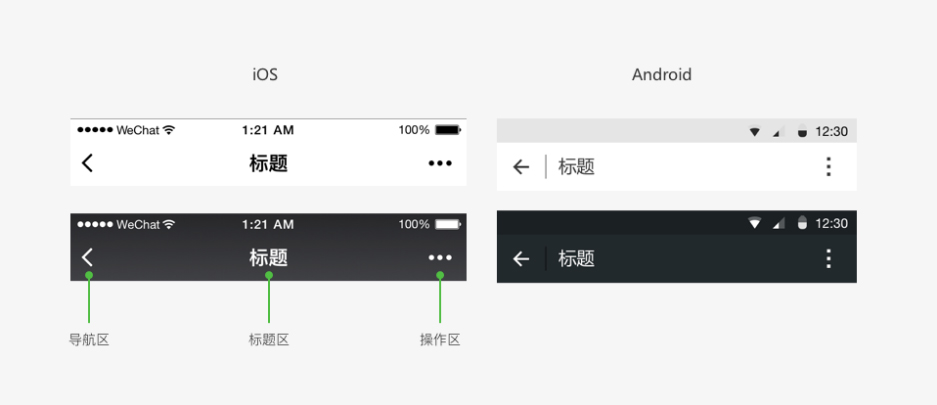 微信導(dǎo)航欄分為導(dǎo)航區(qū)域、標(biāo)題區(qū)域以及操作區(qū)域。其中導(dǎo)航區(qū)控制程序頁面進程。目前導(dǎo)航欄分深淺兩種基本配色,在iOS和Android展示有所不同,如下圖所示: