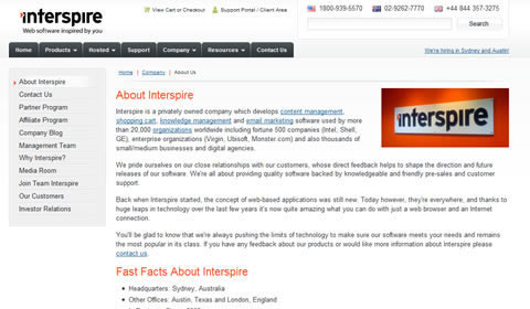 當(dāng)你在設(shè)計(jì)中克制而明智地使用色彩時(shí),吸引訪客對(duì)重要項(xiàng)目的注意力就變得相當(dāng)容易。在 Interspire 的 “About Us(關(guān)于我們)” 頁(yè)面中,訪客的注意力被迅速吸引到頁(yè)面頂部LOGO那紅色的一點(diǎn)上,然后是標(biāo)題,然后是頁(yè)面右邊的LOGO照片。