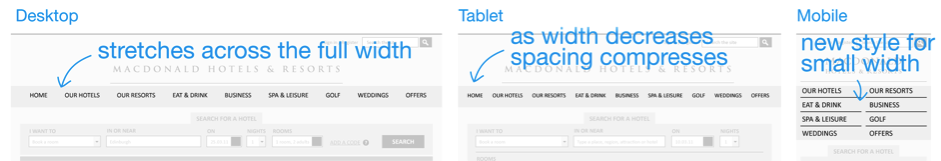我們將使用一個真實的酒店網(wǎng)站 作為范例,來演示響應式Web設計的流程。這個網(wǎng)站是我們在九月份剛剛為Macdonald連鎖酒店創(chuàng)建的。在整個設計開發(fā)流程中,有幾個關鍵步驟,是我們接下來要逐一展開學習的: