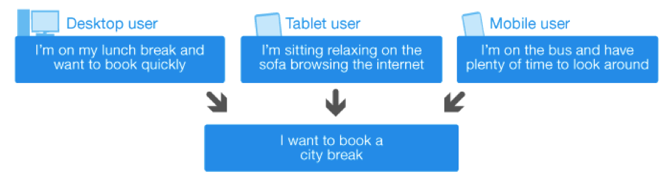 過去,我們通常會假設用戶在使用移動設備訪問網(wǎng)站時,其行為都是高度目標驅(qū)動化的,例如在旅途中獲取酒店地址、預訂房間一類。但實際情況不僅如此——智能手機、平板電腦等各類移動設備的用戶,會越來越多的在相對穩(wěn)定從容的狀態(tài)下使用網(wǎng)絡。所以在很多時候,用戶使用不同設備的目標差別并沒有想象的那么大,我們不能片面的假設不同類型設備的用戶對功能的需求差異。