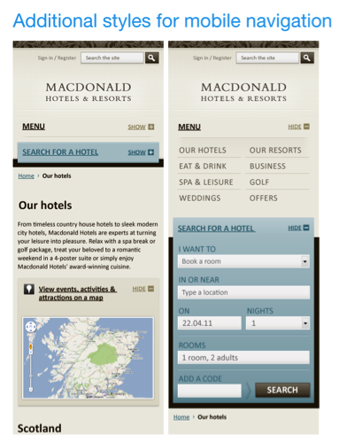 相比于傳統(tǒng)的Web視覺設計過程,在這里我們不僅要打造出風格恰當?shù)腢I元素,而且要根據(jù)前面制定下來的幾種規(guī)格方案,對某些關鍵性的UI元素進行樣式擴展或改造。例如下圖所示的酒店搜索模塊,正如我們前面提到的,在小屏幕版本中,最佳實踐方式是做成可展開和收起的模式,而這種交互方式在平板電腦或桌面設備中是不需要的。類似這樣情況,在視覺設計方面需要花些額外的功夫。
