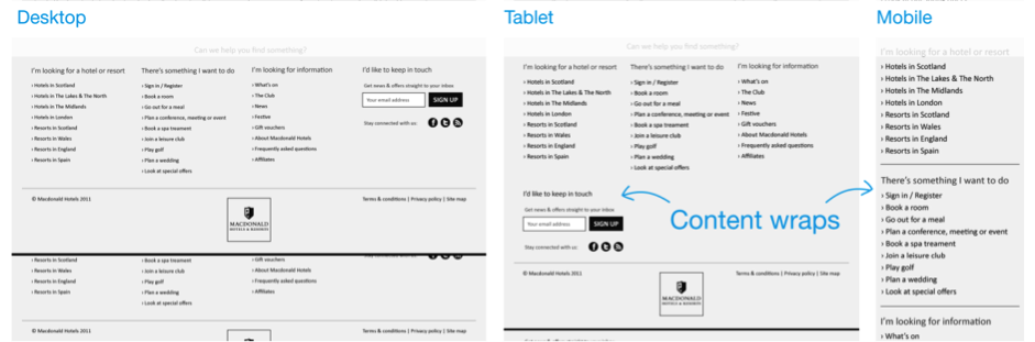 接下來我們需要考慮的是,每一列中的模塊組件應該以怎樣的方式隨著頁面的寬度縮放而響應式的適應和調(diào)整。在這個過程里,保持團隊成員之間的溝通是非常重要的,包括視覺設計師、前端開發(fā)人員等;使用初步的線框原型,與大家交流模塊組件在布局和樣式方面的調(diào)整計劃,盡量在初期就讓相關成員對整個規(guī)劃做到心中有數(shù),并盡早發(fā)現(xiàn)前端實現(xiàn)等方面的潛在的問題。