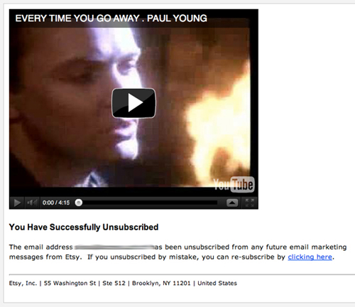 Etsy 會(huì)在用戶(hù)退訂之后播放Paul Young的"Every Time You Go Away"。這種方式無(wú)法讓用戶(hù)留下來(lái),但可以給他們留下深刻的印象。當(dāng)用戶(hù)再一次在Etsy平臺(tái)上瀏覽商品時(shí),多半會(huì)想起這個(gè)有意思的小環(huán)節(jié),或許他們無(wú)論在哪里聽(tīng)到這首歌的時(shí)候還會(huì)想到Etsy呢。