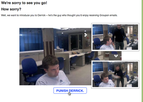 這方面最經(jīng)典的案例莫過(guò)于Groupon的著名段子,"懲罰Derrick"。雖然這個(gè)過(guò)場(chǎng)發(fā)生在用戶(hù)確認(rèn)退訂之后,但它通過(guò)真實(shí)的人物以及鋒利而又自嘲的幽默,切實(shí)拉近了用戶(hù)與網(wǎng)站之間的距離。在這個(gè)多多少少會(huì)使退訂用戶(hù)產(chǎn)生內(nèi)疚的段子之后,Groupon還會(huì)再慫恿用戶(hù)重新進(jìn)行訂閱。雖然你清楚的知道這是他們玩的小伎倆,但在如此具有代入感的段子面前,多數(shù)用戶(hù)會(huì)覺(jué)得非常有趣,正面情緒和狀態(tài)完全被調(diào)動(dòng)起來(lái)。
