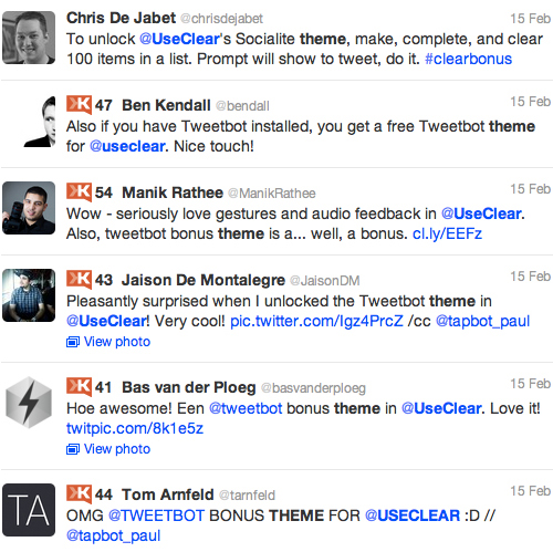 另外,如果你follow了Clear開(kāi)發(fā)者的Twitter帳號(hào),那么還能獲取另外一款獎(jiǎng)勵(lì)主題。這個(gè)彩蛋的作用依然在于傳播。人們會(huì)分享他們的熱忱,甚至談?wù)撍麄儷@得或是錯(cuò)過(guò)了哪些主題。