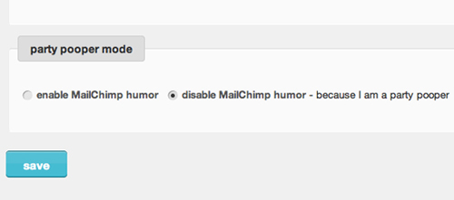 再次以MailChimp為例,他們提供了一種“party掃興模式”,那些對(duì)幽默風(fēng)格不感冒的用戶(hù)可以在這里禁用那些有意思的設(shè)計(jì)元素。