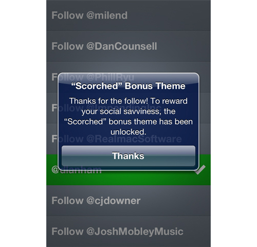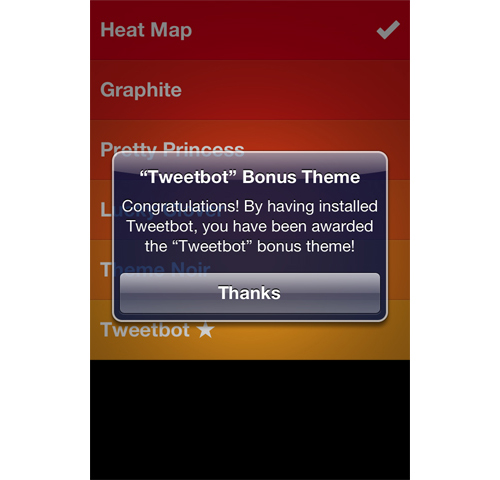 驚喜、專(zhuān)享 :在應(yīng)用中打開(kāi)主題設(shè)置界面后,安裝了Tweetbod的用戶(hù)會(huì)收到一條消息,恭喜他們獲得了專(zhuān)享的額外主題。這些用戶(hù)很可能因?yàn)槭艿搅颂厥庹疹櫠械介_(kāi)心,另外,這個(gè)群體在口碑傳播方面的作用是相當(dāng)大的。
