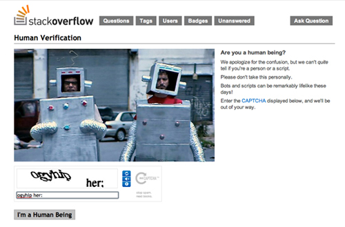 驗(yàn)證工具Captcha在如今被很多網(wǎng)站所使用,但這不意味著用戶(hù)真的喜歡這東西,很多時(shí)候Captcha確實(shí)會(huì)令人感到煩惱和挫敗。我們暫時(shí)無(wú)法改變這個(gè)工具本身的工作機(jī)制,但至少可以像Stack Overflow那樣通過(guò)一幅有趣的圖片搭配說(shuō)明文案,向用戶(hù)解釋為什么要使用這個(gè)煩人的工具,籍此獲得用戶(hù)的理解,減少負(fù)面情緒的產(chǎn)生。