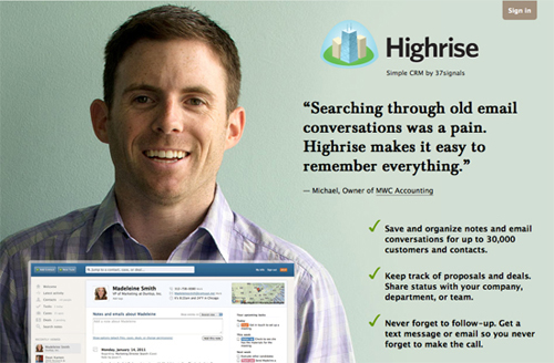 通過(guò)這張圖片,Highrise 向我們展示了一個(gè)快樂(lè)的人,還有他使用該公司產(chǎn)品的故事。來(lái)自實(shí)際客戶(hù)的微笑以及贊許之辭,這是非常正面的、非常容易促使?jié)撛谟脩?hù)認(rèn)同并期望獲取其產(chǎn)品的宣傳形式。
