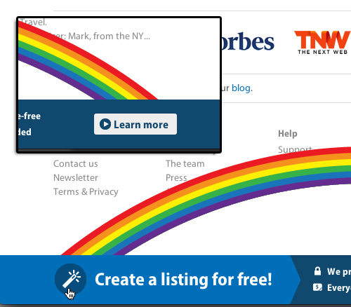 驚喜 :瀏覽到頁(yè)腳,你會(huì)發(fā)現(xiàn)鼓勵(lì)你免費(fèi)創(chuàng)建活動(dòng)的圖標(biāo)與文案,當(dāng)鼠標(biāo)懸停在圖標(biāo)上的時(shí)候,一道絢麗的彩虹會(huì)突然冒出來(lái),它的動(dòng)畫(huà)效果所指向的正是引導(dǎo)用戶(hù)這個(gè)操作的按鈕。
