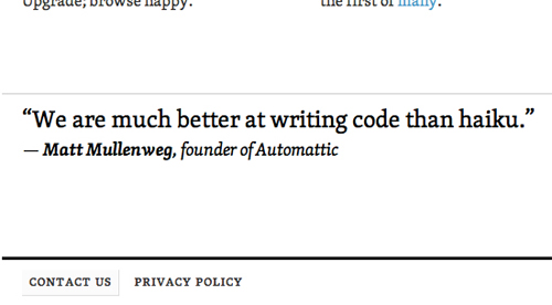 標(biāo)語(yǔ) :Automattic的標(biāo)語(yǔ)之一是“比起俳句,我們更擅長(zhǎng)寫(xiě)代碼”。正是這種看似嚴(yán)肅認(rèn)真的幽默感,或者說(shuō)看似幽默的認(rèn)真,奠定了他們的產(chǎn)品基調(diào)。