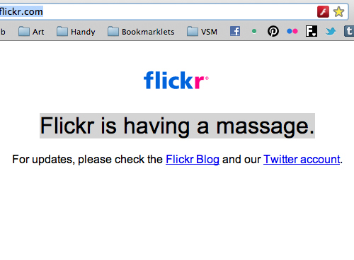 用戶(hù)在Flickr進(jìn)行系統(tǒng)維護(hù)或升級(jí)期間會(huì)看到"Flickr正在做按摩"的提示,如果有興趣的話(huà)還可以到他們的官方博客或是微博當(dāng)中查看當(dāng)前的具體狀況。這樣的文案比起簡(jiǎn)單粗暴的出錯(cuò)提示來(lái)說(shuō)更能讓用戶(hù)接受。