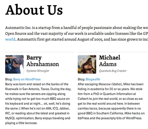 幽默 :在A(yíng)utomattic的“關(guān)于”頁(yè)面中充滿(mǎn)了和善幽默的自我介紹,感興趣的用戶(hù)在閱讀時(shí)就能感受到他們那種充滿(mǎn)樂(lè)趣的工作環(huán)境。