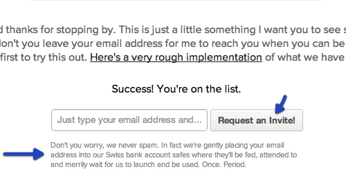 下面的范例來(lái)自我的一個(gè)個(gè)人項(xiàng)目,用戶(hù)需要邀請(qǐng)碼才可以試用這個(gè)產(chǎn)品。在提交申請(qǐng)的地方,我使用“我要獲取邀請(qǐng)!”來(lái)代替?zhèn)鹘y(tǒng)的“提交”作為按鈕當(dāng)中的文案,希望這可以調(diào)動(dòng)起用戶(hù)的情緒,并使他們感受到一種更加真實(shí)、更加有針對(duì)性的互動(dòng)。另外我也起草了一份簡(jiǎn)單的說(shuō)明文案,讓用戶(hù)放心,我們絕不會(huì)發(fā)送垃圾郵件。