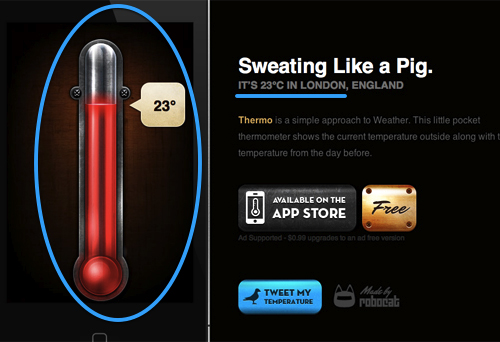 Thermo 應(yīng)用的著陸頁(yè)可以判斷用戶(hù)所處的地理位置,并在左側(cè)以高度擬真的視覺(jué)表現(xiàn)形式來(lái)告訴用戶(hù)當(dāng)?shù)氐臍鉁厍闆r。