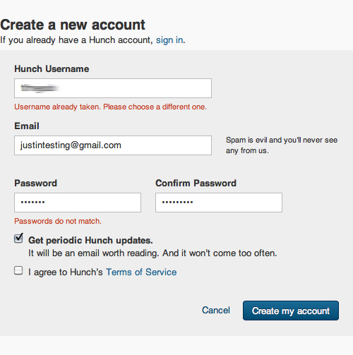 Hunch 注冊(cè)頁(yè)面當(dāng)中的文案與我們通常能夠見(jiàn)到的那種有所不同,他們會(huì)在輸入郵件的文本框旁邊告訴你“垃圾郵件是魔鬼,我們可不干這事”,還會(huì)在選擇郵件訂閱的地方提示你“這會(huì)是值得一讀的郵件,而且來(lái)的不會(huì)太頻繁”。在這些很普通的地方稍稍花些心思,制造一些細(xì)微的差異化,這會(huì)增強(qiáng)產(chǎn)品的代入感,使用戶(hù)的注意力更集中,跟隨設(shè)計(jì)的指引完成操作目標(biāo)。