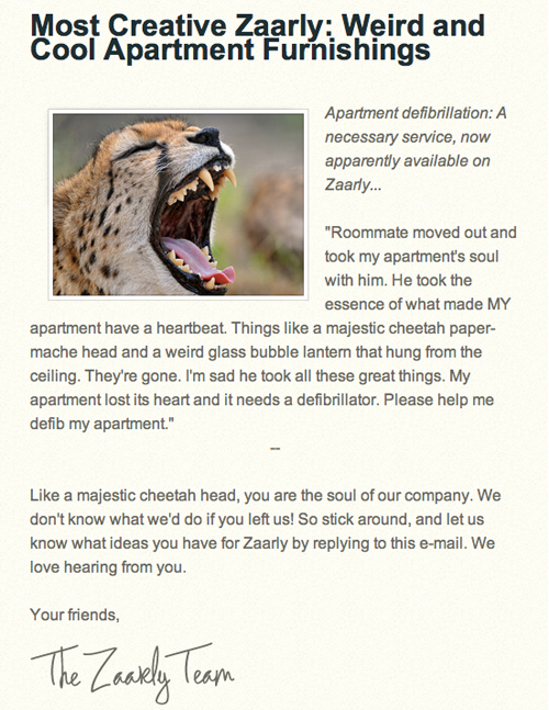 Zaarly在他們的郵件快報(bào)中講了一些具有神秘色彩的小故事,這種方式提升了郵件的吸引力,使用戶(hù)不由自主的對(duì)其中的內(nèi)容以及這個(gè)網(wǎng)站提供服務(wù)產(chǎn)生好奇,而不是一味的排斥。