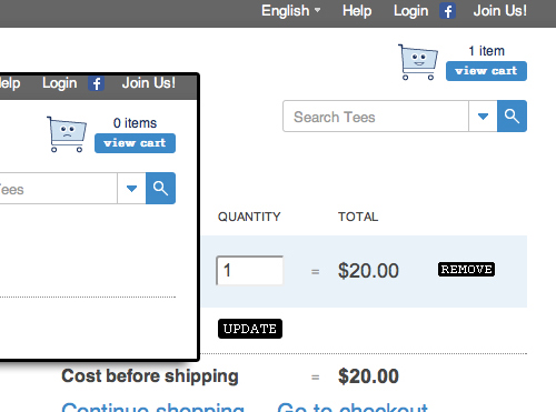 Threadless 的購(gòu)物車(chē)在沒(méi)有商品放入時(shí)會(huì)呈現(xiàn)出憂(yōu)傷的表情,反之則會(huì)表現(xiàn)的非常開(kāi)心。這樣的小細(xì)節(jié)會(huì)讓你覺(jué)得平凡而有趣,甚至?xí)挥勺灾鞯男ζ饋?lái)。即使用戶(hù)最終沒(méi)有產(chǎn)生購(gòu)物行為,他們也會(huì)記住這個(gè)可愛(ài)的購(gòu)物車(chē)。