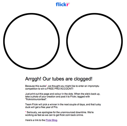 同樣來(lái)自于Flickr的案例。當(dāng)系統(tǒng)發(fā)生了一些更加嚴(yán)重的問(wèn)題時(shí),他們會(huì)告訴用戶(hù):“額,我們的管道堵塞了!”,然后使用非??谡Z(yǔ)化的文案表示了歉意。除此之外,他們還為用戶(hù)設(shè)置了一個(gè)小任務(wù),也就是將當(dāng)前頁(yè)面打印出來(lái),為兩個(gè)圓環(huán)填色,然后拍下來(lái),等到站點(diǎn)恢復(fù)正常后傳到Flickr上;Flickr團(tuán)隊(duì)會(huì)挑選出優(yōu)勝者,向他們贈(zèng)送一年的高級(jí)帳號(hào)。