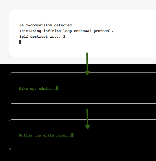 彩蛋 :在WordPress的self-comparison當(dāng)中有個(gè)彩蛋。為了防止相同版本的文章進(jìn)行自我比較,Automattic創(chuàng)建了一個(gè)小機(jī)制,無(wú)論是其中的文案還是視覺(jué)風(fēng)格都模仿了黑客帝國(guó)當(dāng)中的段子。這篇文章 會(huì)教你怎樣在WordPress當(dāng)中找到這個(gè)彩蛋。