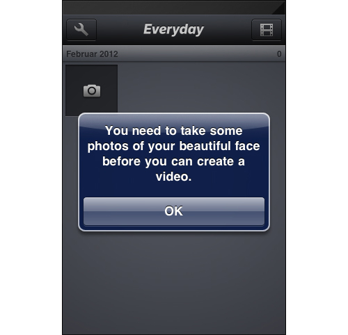 在"Everyday"應(yīng)用當(dāng)中,如果你還沒(méi)有向媒體庫(kù)中添加照片,那么系統(tǒng)就會(huì)非常友好的提示你去給自己“漂亮的臉蛋”拍些照片放到庫(kù)中——簡(jiǎn)單的詞匯定義了提示信息甚至是產(chǎn)品的基調(diào),換句話(huà)說(shuō),就是個(gè)性。