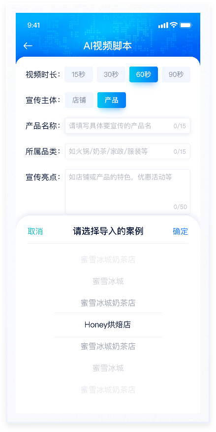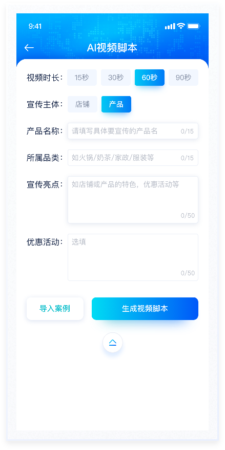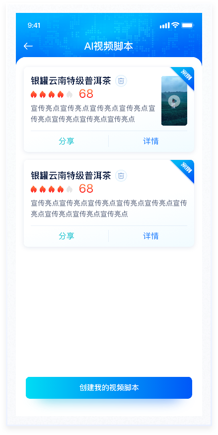 AI生成視頻腳本是用戶輸入相應(yīng)條件后,AI大模型通過系統(tǒng)算法生成視頻內(nèi)容。整體風(fēng)格較為科技感,因此在配色上使用藍色漸變及較重投影,符合產(chǎn)品屬性,能夠突出產(chǎn)品的創(chuàng)新性和先進性。使用戶在使用過程中感受到強烈的視覺沖擊和沉浸感,這種體驗有助于增強用戶對產(chǎn)品的興趣。