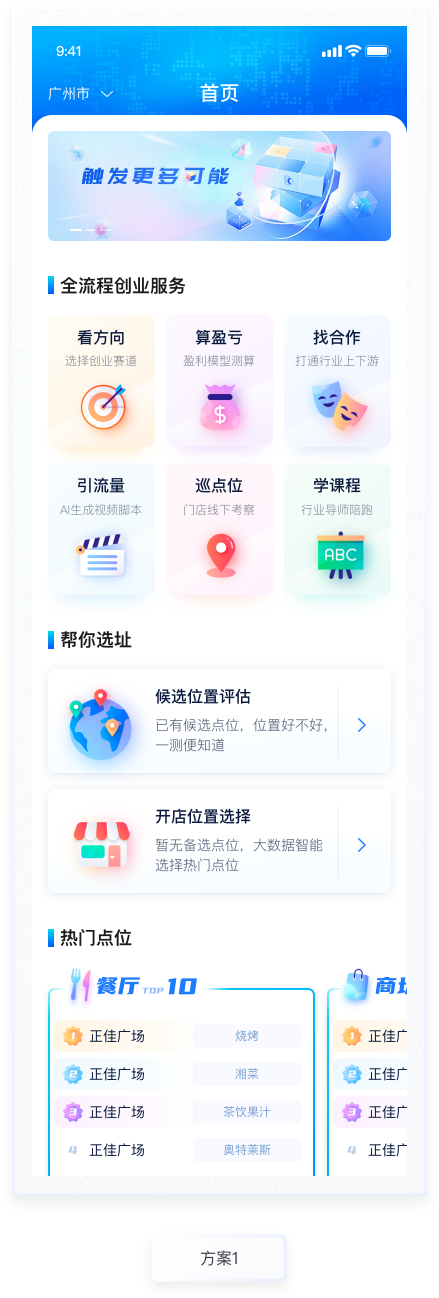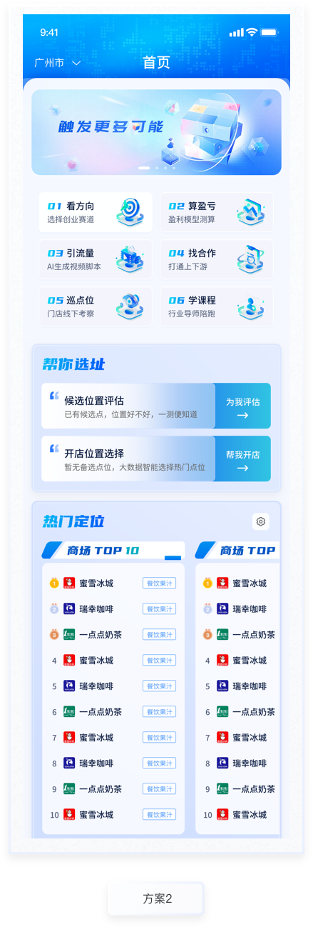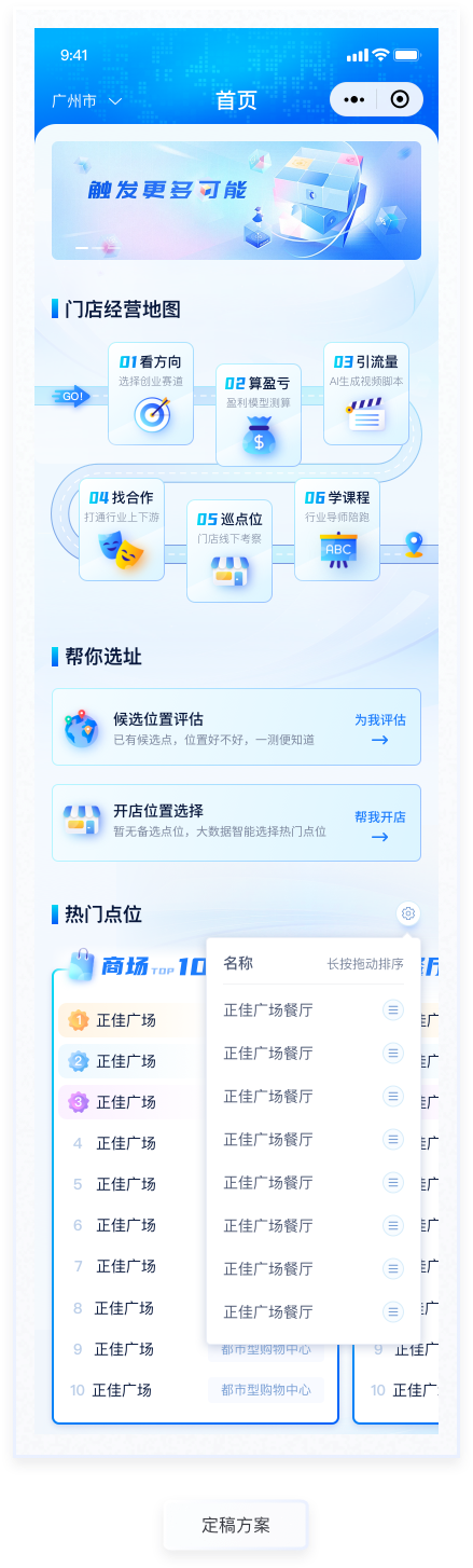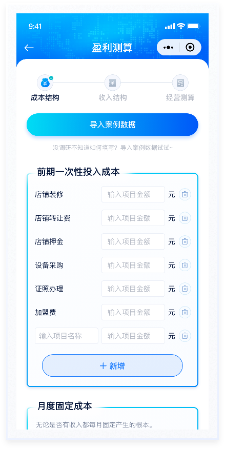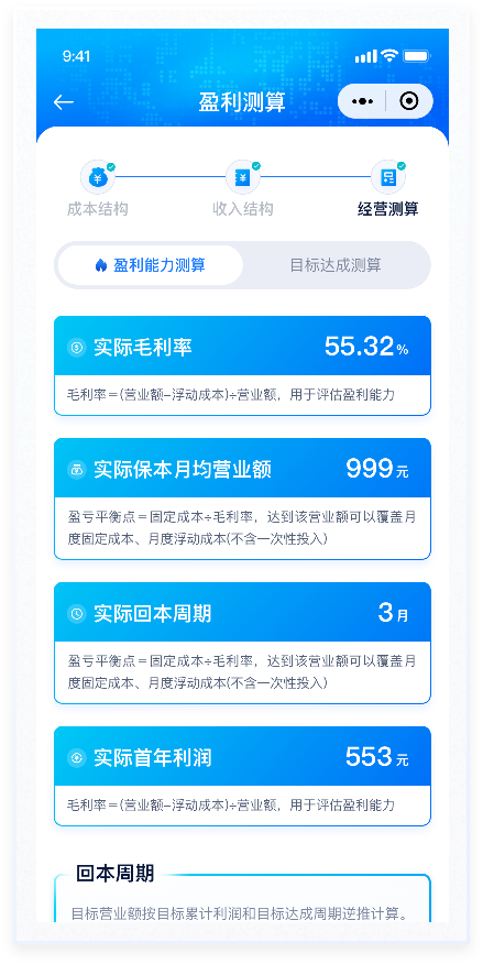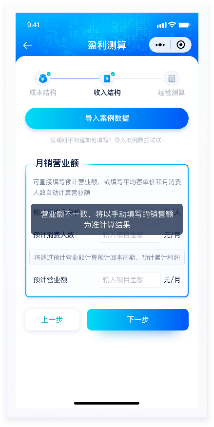 所盈利測算功能是產(chǎn)品的主要功能,通過AI對未來開店盈虧情況進行預(yù)測評估。本次設(shè)計主要優(yōu)化該流程的交互及視覺表現(xiàn),整個流程分為“成本結(jié)構(gòu)”“收入結(jié)構(gòu)”“經(jīng)營測算”三個階段,過程填寫情況放置在頁面頂部,一步了然。已填寫使用主題色標(biāo)注,未填寫則使用置灰顏色處理,符合用戶基本感知。按鈕使用與主色相近的漸變色。
