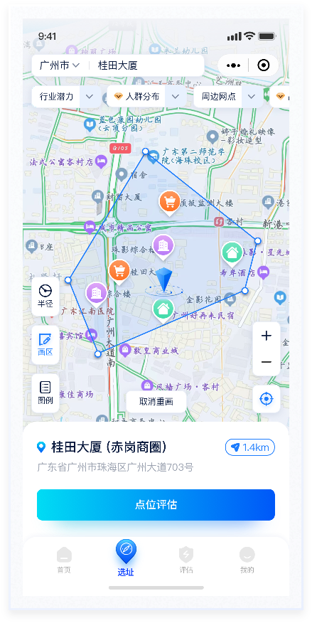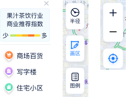 按鈕換膚在地圖上,“半徑”“選區(qū)”便于用戶對開店范圍的選擇,“圖例”則更側(cè)重圖標(biāo)說明性?!胺糯蟆薄翱s小”“定位”則是對顯示內(nèi)容的操作。