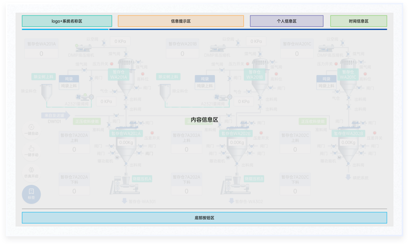 依據(jù)行業(yè)屬性和交互方式,使用環(huán)境的分析結(jié)果,對(duì)界面區(qū)域進(jìn)行了相應(yīng)的劃分,通過(guò)區(qū)域的大小和顏色區(qū)分信息的重要程度,主要信息+輔助信息,以結(jié)構(gòu)化的方式像用戶輸出多維信息,讓用戶直觀全面獲取信息,為決策和操作提供依據(jù)。